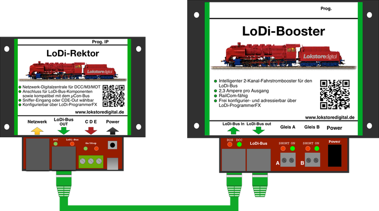 Der LoDi-Bus ( ehemaliger µCon-Bus ) ist ein Bus, der speziell für Booster entwickelt wurde, um lange Distanzen ohne Verlust des Datensignal zu überwinden. Der Bus ist frei und kann direkt bei uns auf der Webseite für Entwickler geladen werden. Im LoDi-Bus müssen die Teilnehmer nacheinander eingesteckt werden, der Bus sieht keinen sternförmigen Aufbau vor. Anhand des folgenden Beispiel sehen Sie, wie der Booster von dem LoDi-Rektor mit Informationen versorgt wird. Der LoDi-Rektor stellt in diesem Fall die Daten für den Booster zur Verfügung und schickt diese über den LoDi-Bus. Darüber hinaus kann der Booster ebenfalls Daten an den LoDi-Rektor und somit an den LoDi-ProgrammerFX oder die Modellbahnsteuerung liefern. Diese Daten können Strommessung pro Kanal, Spannungsmessung, Short A und B und Gerätetemperaturen sein. Am Booster lassen sich neben verschiedenen Kurzschlussempfindlichkeiten auch die Adresse über den LoDi-Rektor mit dem LoDi-ProgrammerFX einstellen. Das Railcom Cutout ist beim LoDi-Booster abschaltbar. Nähere Informationen finden Sie im Abschnitt LoDi-ProgrammerFX.