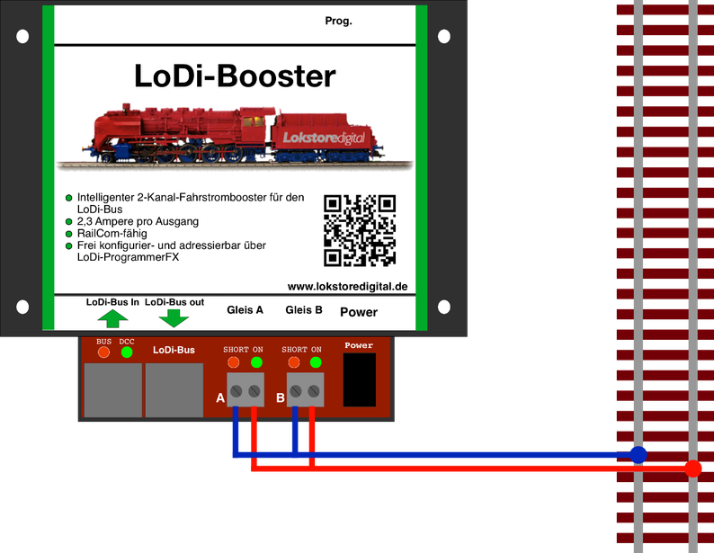 In diesem Beispiel verwenden wir 2 LoDi-Booster, somit stehen uns 4 Stromabschnitte zur Verfügung. Die unterschiedlichen Stromkreise sind nun farblich gekennzeichnet. Sollte nun auf einem dieser Bereiche ein Kurzschluss festgestellt werden, wird dies an den LoDi-Rektor weitergegeben, der den betroffenen Gleisabschnitt an die Modellbahnsteuerungssoftware weiterleitet. Der Rest der Anlage fährt, wenn möglich, weiter. 10. LoDi-Booster Ausgänge zusammenschließen Wenn Sie einen größeren Schattenbahnhof in ihrer Anlage betreiben, oder eine größere Spur fahren und mehr als 2,3 Ampere benötigen, können sie die beiden Boosterausgänge brücken. Dies ist mit dem LoDi-Booster kein Problem. Schließen Sie die Ausgänge Gleis A und Gleis B parallel, also gebrückt ans Gleis, so wie Sie auf Schaubild ersehen können. Dadurch stehen Ihnen dann maximal 5 Ampere zur Verfügung. Bitte achten Sie dabei auf einen ausreichenden Kabelquerschnitt!
